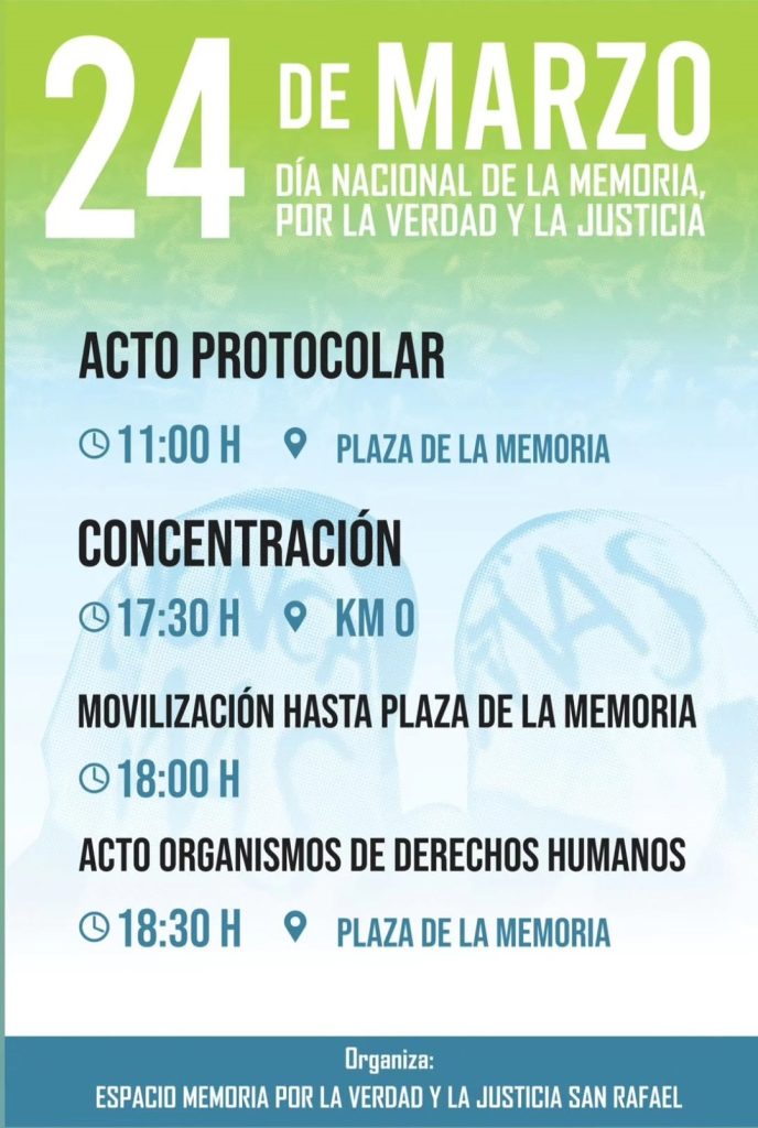 El próximo lunes 24 de marzo, San Rafael recordará el Día Nacional de la Memoria por la Verdad y la Justicia con una serie de actividades organizadas por el Espacio Memoria por la Verdad y la Justicia a 49 años del inicio de la última Dictadura Militar en Argentina.