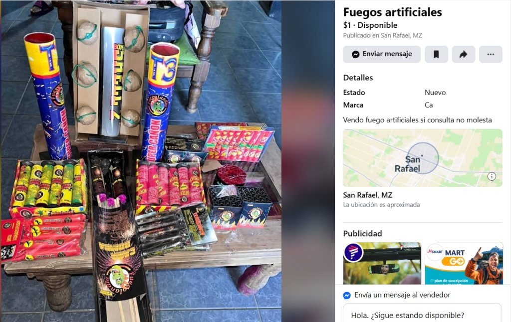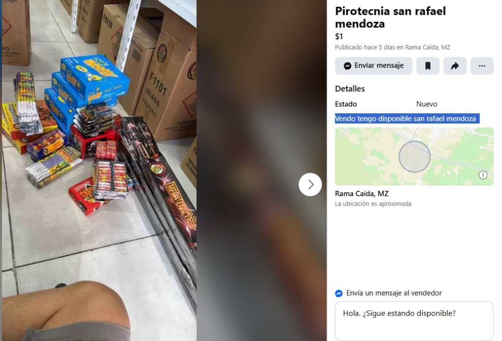 Aunque en San Rafael la venta y uso de pirotecnia está prohibida desde 2017, distintos usuarios continúan ofreciendo estos productos de manera clandestina a través de redes sociales, principalmente en Facebook Marketplace y grupos de compra-venta.