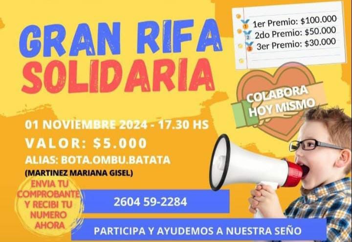 Ante el triste episodio, el grupo de madres de los tres primeros grados y padres que se unieron, decidieron hacer una rifa solidaria para ayudar a la “seño” a recuperar el bien robado. Los premios son tres: el 1) 100 mil pesos en efectivo; el 2) 50 mil pesos en efectivo; el 3) 30 mil pesos en efectivo. La participación tiene un valor de 5 mil pesos, el sorteo será el 1 de noviembre a las 17.30 ante escribano público (padre de uno de los alumnos).