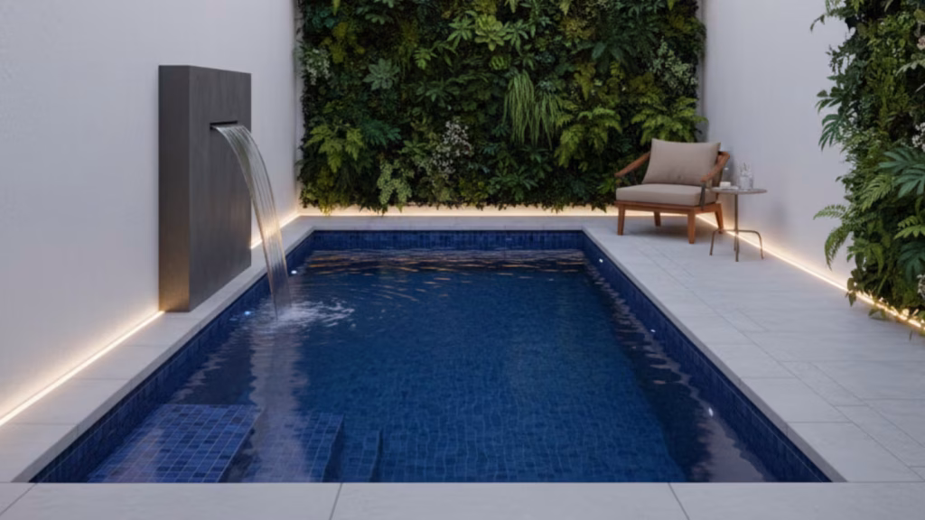 Las luces LED, las tiras cálidas o los focos subacuáticos crean un ambiente mágico al caer el sol, ideal para disfrutar el espacio también de noche. Podés delimitar el área con paneles de madera, celosías o pérgolas, y sumar piedras, arena clara o jardines verticales para reforzar la sensación de refugio natural.