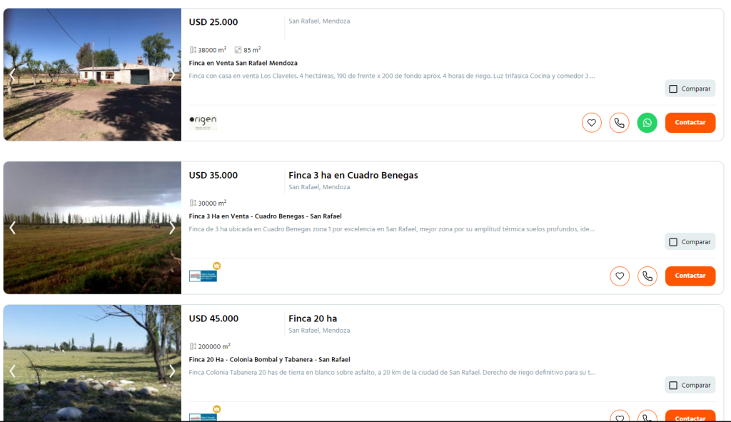 En Mercado Libre Inmuebles ofrece una en La Llave de 31 hectáreas con viñedos, alfalfa, riego y tractor por U$D 85 mil, también otra en Cuadro Benegas de 12 hectáreas con 8 implantadas con ciruelos, dos galpones y casa por U$D 100 mil.