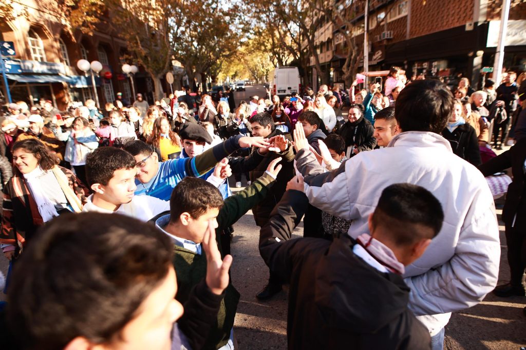 A las 10 ya estaba el centro listo para la celebración patria, que si bien iba a tener lugar hace unos días, debió suspenderse debido a las condiciones climáticas existentes. El corte de la Av. San Martín fue desde calle Chile hasta Belgrano, en dos cuadras con cientos de asistentes que se agolpaban por ver bailar a los niños, al ritmo del Pericón Nacional, con el acompañamiento de la Banda de Música de la Policía de Mendoza, dirigida por el Of. Insp. José Luis Espejo.
