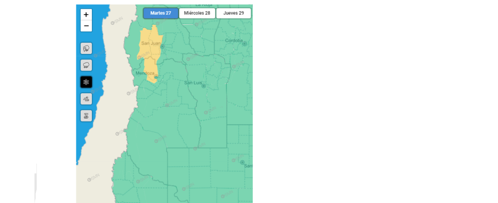 El Servicio Meteorológico Nacional emitió una alerta amarilla para la noche de este martes por nevadas en precordillera.