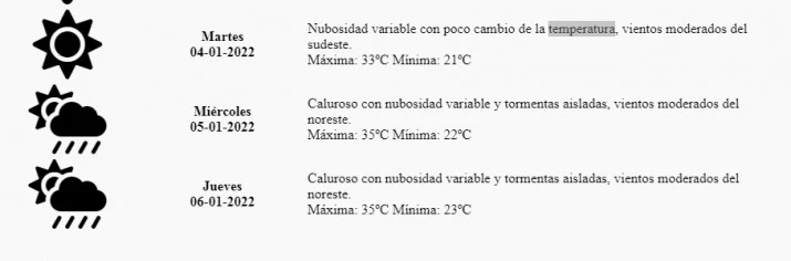 En tanto que para el martes pronosticaron: «Nubosidad variable con poco cambio de la temperatura. Vientos moderados del sudeste. Máxima: 33ºC. Mínima: 21ºC».