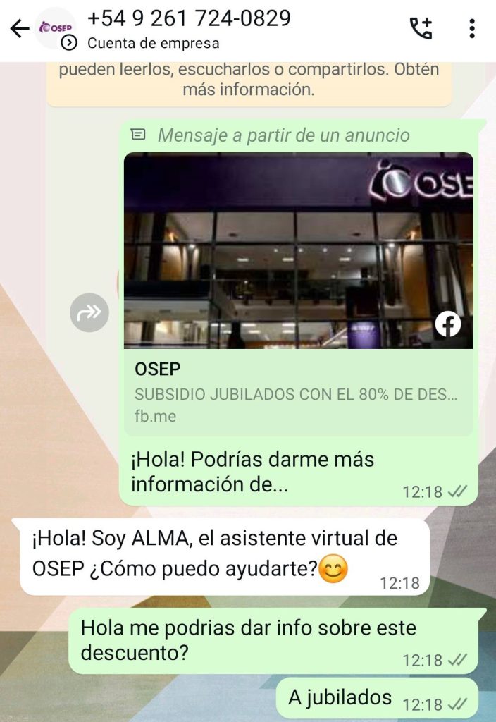 La conversación comenzó con una atención «personalizada», en la que un joven con acento porteño se hacía pasar por Alma, el asistente virtual oficial de OSEP. Incluso tratando de generar “conversación” con la potencial damnificada.