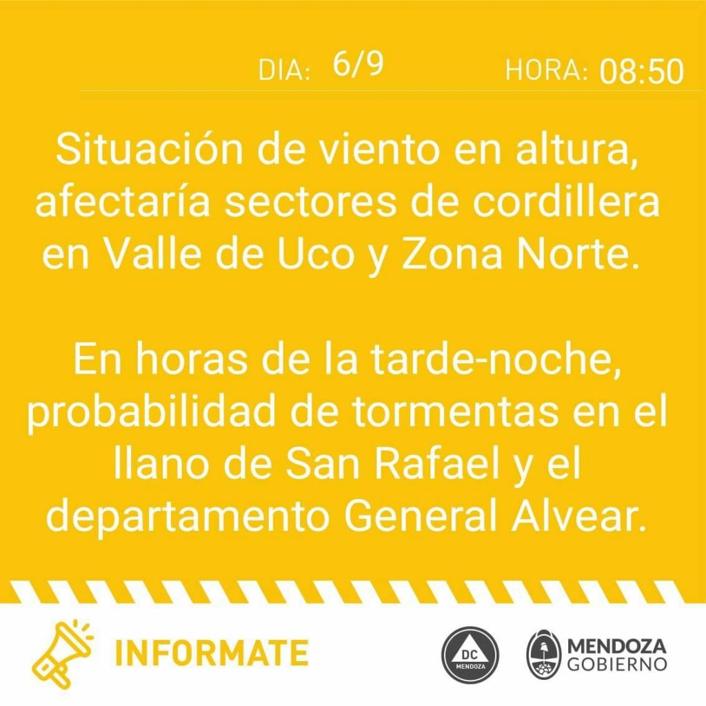 «Situación de viento en altura, afectaría sectores de cordillera en Valle de Uco y Zona Norte», advierten desde el organismo en primer lugar.