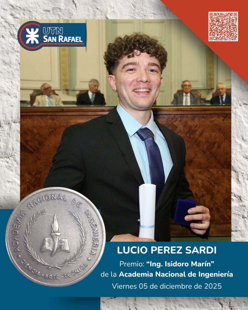 La Academia Nacional de Ingeniería distinguió con el premio “Ing. Isidoro Marín” a Lucio Pérez Sardi, egresado de la Facultad Regional San Rafael de la UTN, reconocimiento que se otorga anualmente a las y los mejores graduados de carreras de Ingeniería de universidades de todo el país.