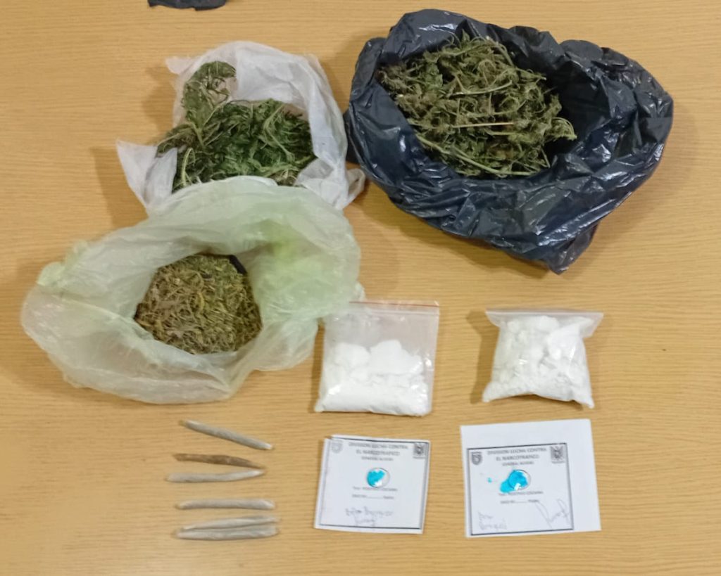 También se encontró un bolso tipo lonchera que contenía dinero, un cajón de madera donde se guardaban los cogollos y cigarrillos, una planta de marihuana en floración de 4,50 metros de alto con un peso de 25.165 gramos en estado natural, y ramas en proceso de secado con un peso de 2.805 gramos.