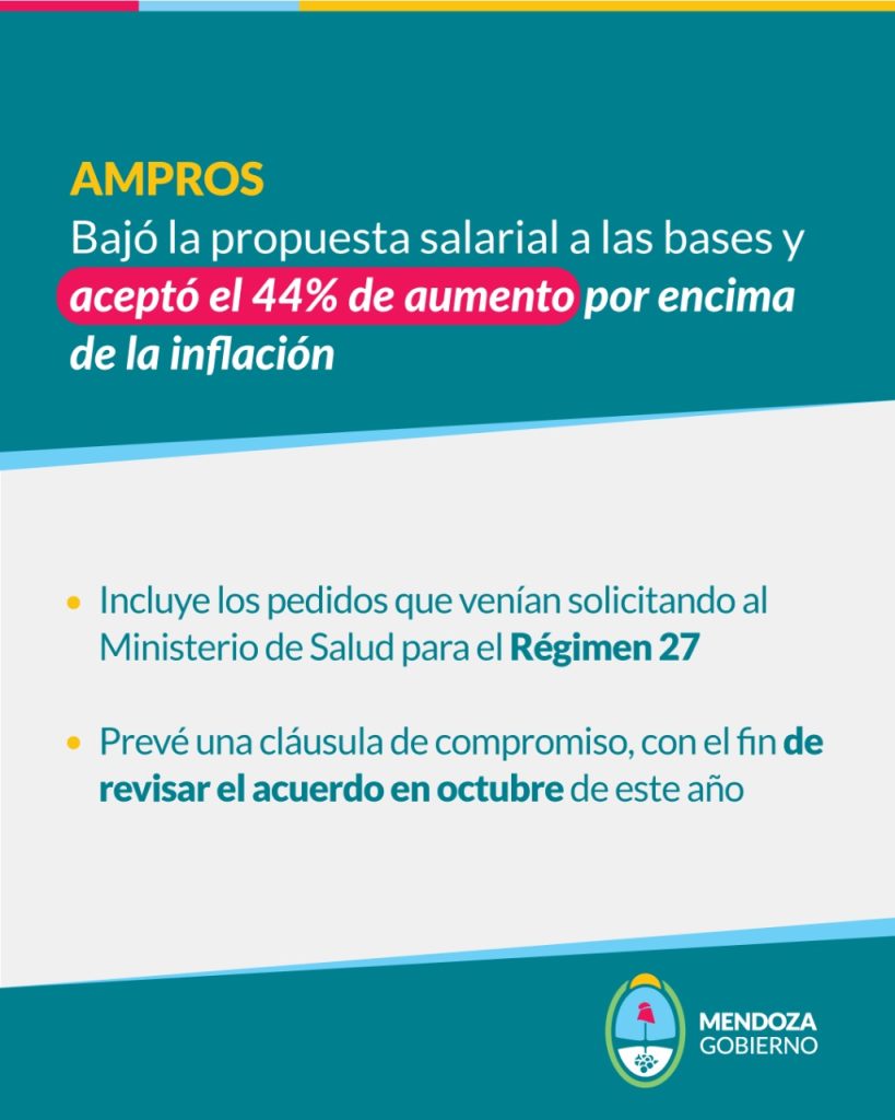 Ayer por la tarde se informó que AMPROS aceptó el aumento del 44% por encima de la inflación. En el caso del gremio que nuclea al sector de Salud (AMPROS) que decidió aceptar la oferta, fue luego de bajar a las bases la propuesta del Gobierno provincial del aumento del 44% por encima de la inflación. De esta manera, los trabajadores de la Salud percibirán lo que venían solicitando para el régimen 27 y se establece una cláusula de compromiso, con el fin de revisar el acuerdo en octubre de este año.