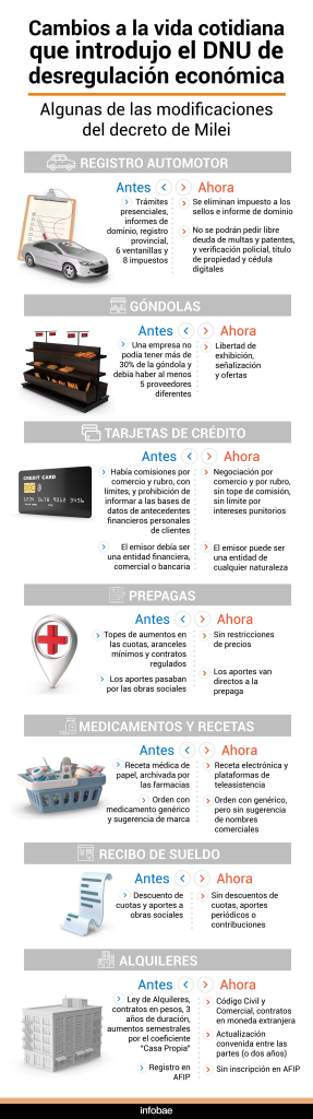 En ese marco, Infobae repasó las principales modificaciones en el registro automotor, la oferta en góndolas, tarjetas de crédito, prepagas, medicamentos y recetas, recibos de sueldo y alquileres.