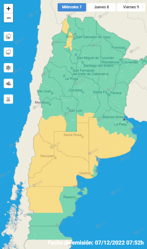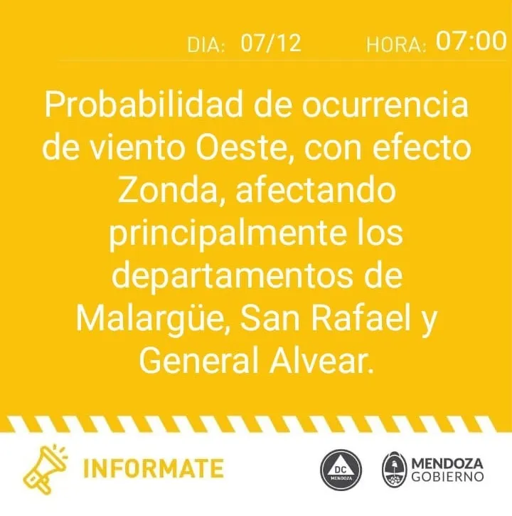 En consonancia con el SMN, Defensa Civil advirtió que en los departamentos de Malargüe, General Alvear y San Rafael “la ocurrencia de viento oeste podría tener efecto Zonda”.