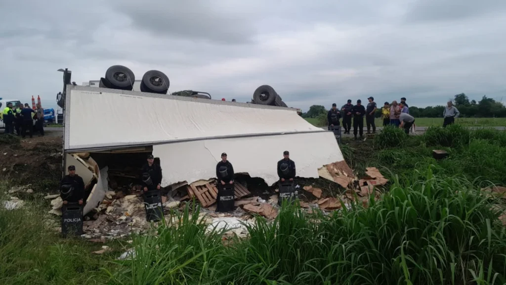 El camión transportaba fiambres y lácteos. Al llegar la Policía al lugar del accidente había una gran cantidad de vecinos llevándose los productos comestibles que transportaba el acoplado.