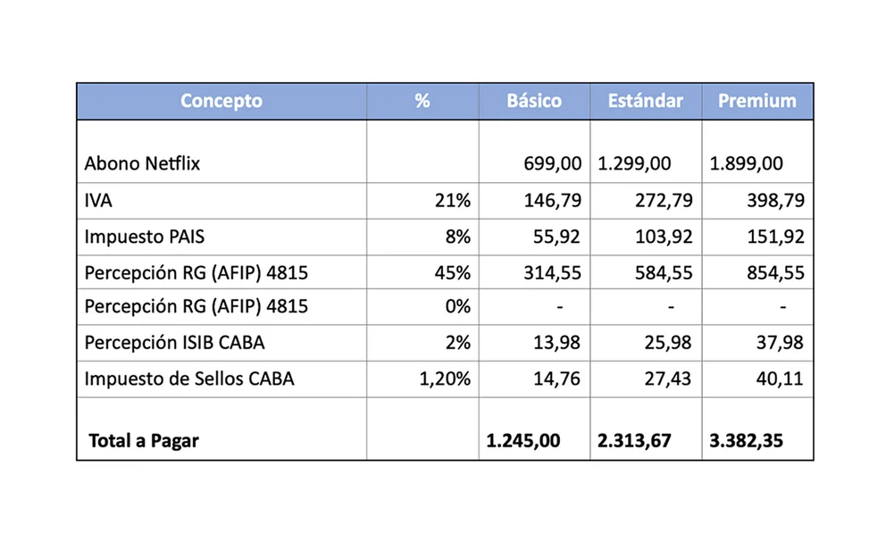“De los impuestos y percepciones que se cobran, el único que técnicamente debería cobrarse es el IVA. El IVA debe cobrarse para cumplir con el principio de neutralidad y equipar a quienes prestan servicios de streaming en la Argentina respecto a quienes lo prestan en el exterior. Si no se cobrara, se podrían ver beneficiados quienes prestan el servicio en el exterior respecto a los que lo prestan en el país ya que estos últimos deben cobrar el IVA y los primeros no lo harían”, añadió Domínguez.