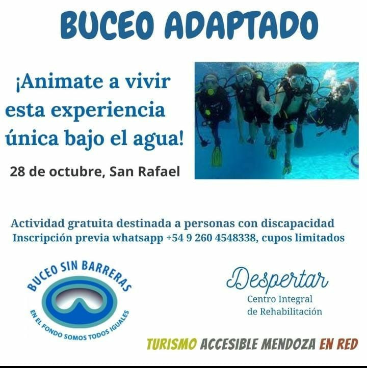 “Buceo sin barreras”, es una fundación de Buenos Aires que se dedica específicamente al buceo inclusivo o adaptado para personas con discapacidad. Con la presencia de sus profesionales, el 28 de octubre en el centro de rehabilitación “Despertar”, ubicado en la calle 3 de Febrero 1460 (entre Jujuy y Necochea), se llevará a cabo la primera jornada de buceo inclusivo en San Rafael, con expectativas de que crezca el evento en los años siguientes.