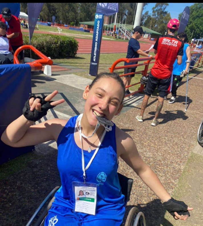 El año pasado, motivada por las clases de educación física en su escuela, Delfina se animó a participar en pruebas de lanzamiento de bala y en carreras de 200 metros. Fue tal su desempeño que primero ganó en San Rafael y luego fue seleccionada para competir en los Juegos Sanmartinianos. Allí, sin experiencia previa en silla de ruedas, utilizó una prestada por el PAMI y logró el campeonato provincial.