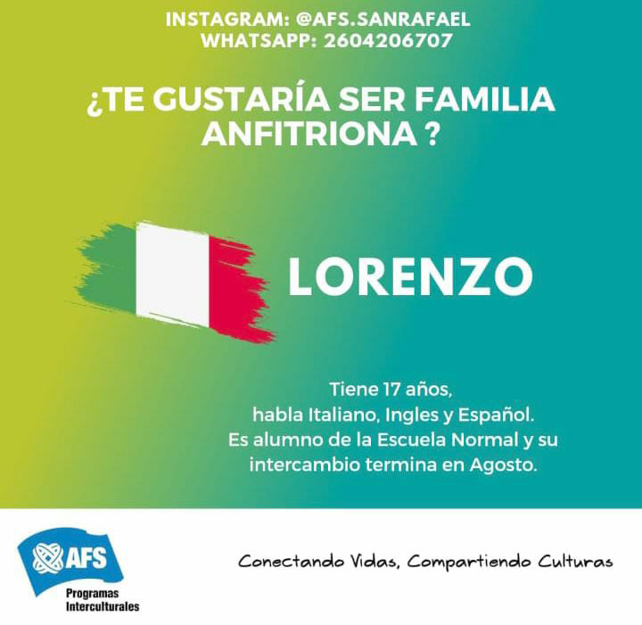 San Rafael se ve enriquecido con la llegada de estudiantes de intercambio, lo cual es una tradición que los gestores del programa AFS llevan adelante con éxito desde hace varios años. Una vez más el mismo está puesto en marcha, en este caso para conseguirle un hogar a un joven italiano. Al respecto dialogó con nuestro diario y con FM Vos, Roxana Díaz, coordinadora del hosting de hospedaje de San Rafael.