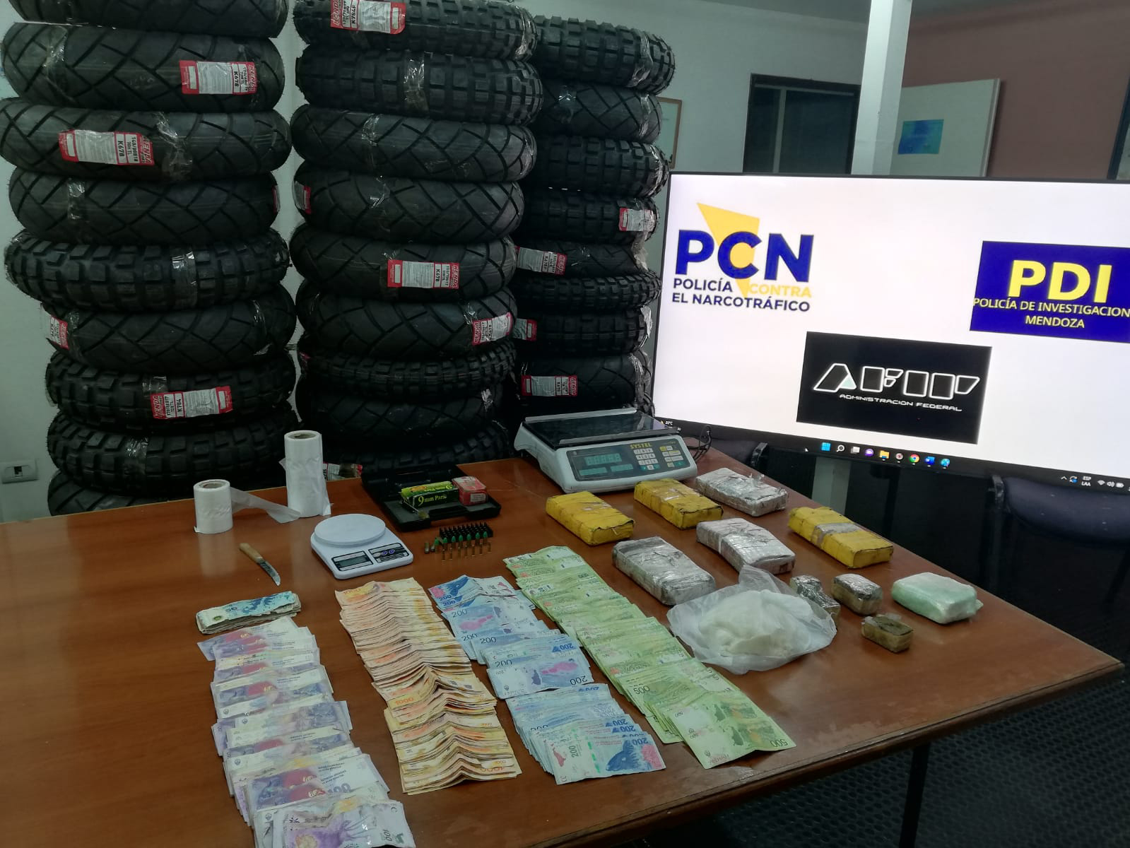 El primer allanamiento tuvo lugar en calle Pedro del Castillo al 5800 de Guaymallén, lugar donde se incautaron 07 ladrillos de cocaína, 400 gramos de marihuana, 17 cartuchos de distintos calibre y 39 cubiertas de moto de distinto rodado del tipo enduro y “pisteras”, 02 balanzas y elementos de fraccionamiento. A raíz de ello, se dispuso la detención de Gabriela D., de 24 años de edad, quien quedó en el domicilio en calidad de detenida comunicada, con prisión domiciliaria.