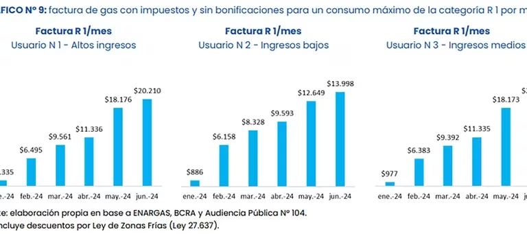 Bajo esos supuestos, el valor de la factura promedio para una familia de ingresos altos (N1) pasaría de $1.335 en enero a $20.210 en junio, la de una familia de ingresos medios (N3) de $977 a $20.207 y la de una familia de ingresos bajos (N2, la única que retendría subsidios) de $886 a $ 13.998 de enero a junio. Las facturas, lógicamente, se hacen más pesadas para consumos R2 (el siguiente ramo de consumo, en que los valores de las facturas llegarían a superar los $44.000 en junio para las clases alta y media y a superar los $26.000 para las familias de menores ingresos.