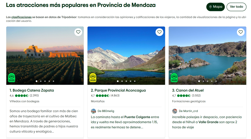 Al analizar el ranking de la provincia de Mendoza, el Cañón del Atuel se ubica en el “top 3” entre las más elegidas.