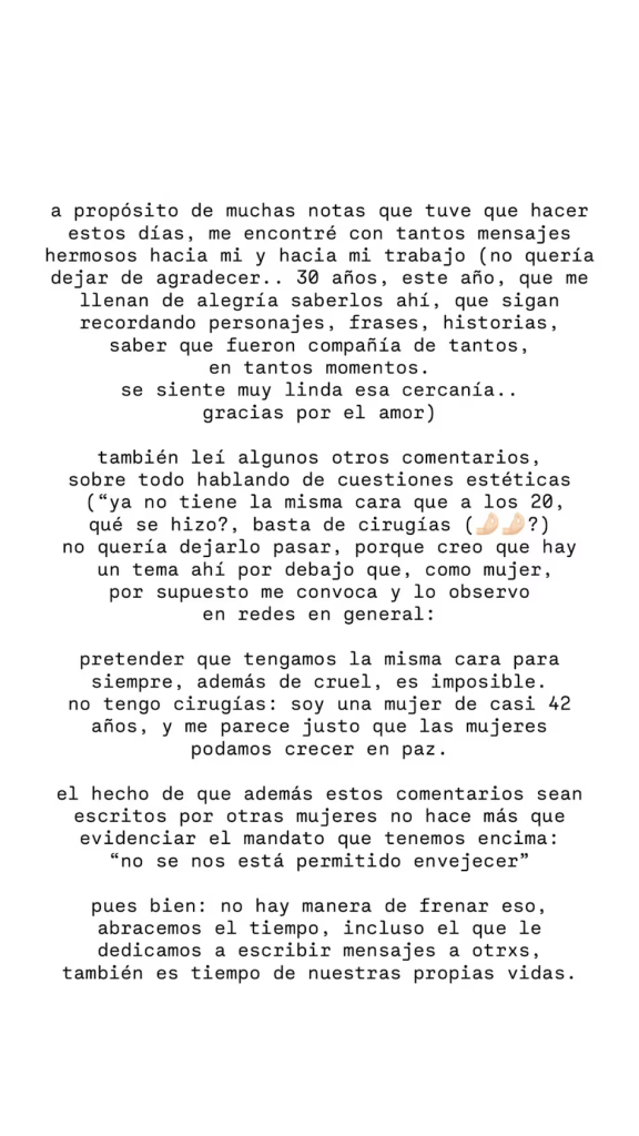 Y luego se refirió a las acusaciones: “Y leí otros comentarios, sobre todo aquellos que hablaban de cuestiones estéticas (‘ya no tiene la misma cara que a los 20′, ‘¿qué se hizo?’, ‘basta de cirugías’)”.