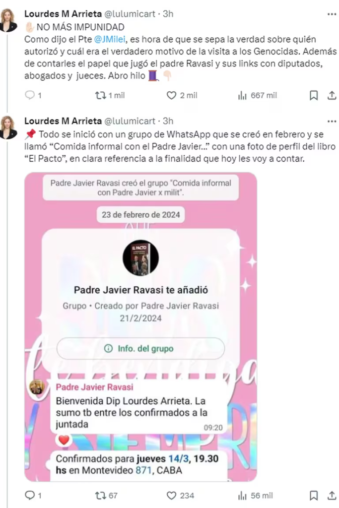 “Como dijo el Presidente Javier Milei, es hora de que se sepa la verdad sobre quién autorizó y cuál era el verdadero motivo de la visita a los genocidas”, sentenció la presidente de LLA Mendoza, tras señalar que el cura Javier Ravasi habría funcionado como el nexo entre los diputados libertarios, abogados y jueces. De hecho, indicó que el sacerdote habría sido el responsable de sumarla al grupo de Whatsapp llamado “Comida informal con Padre Javier x milit”, espacio al que apuntó por ser el origen de todo el escándalo.