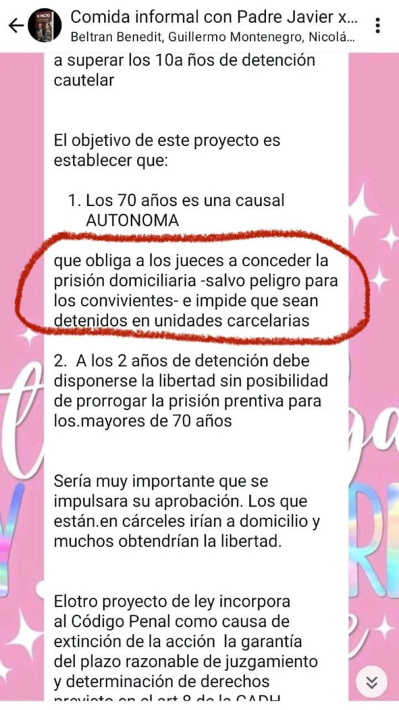 A partir de esto, Olea envió al menos unos dos documentos que contenían iniciativas creadas con el fin de imponer un “plazo razonable de los procesos y modificar la Ley de Ejecución Penal, el Código Penal y Procesal”. En la fila sumó un decreto reglamentario que permitiría sumar a las causas de lesa humanidad dentro del régimen propuesto. “Ravasi agrega que el proyecto tiene como finalidad obligar a los jueces a conceder la prisión domiciliaria manifestando que ‘los que están en cárceles irían a domicilio y muchos obtendrían la libertad’”, subrayó.