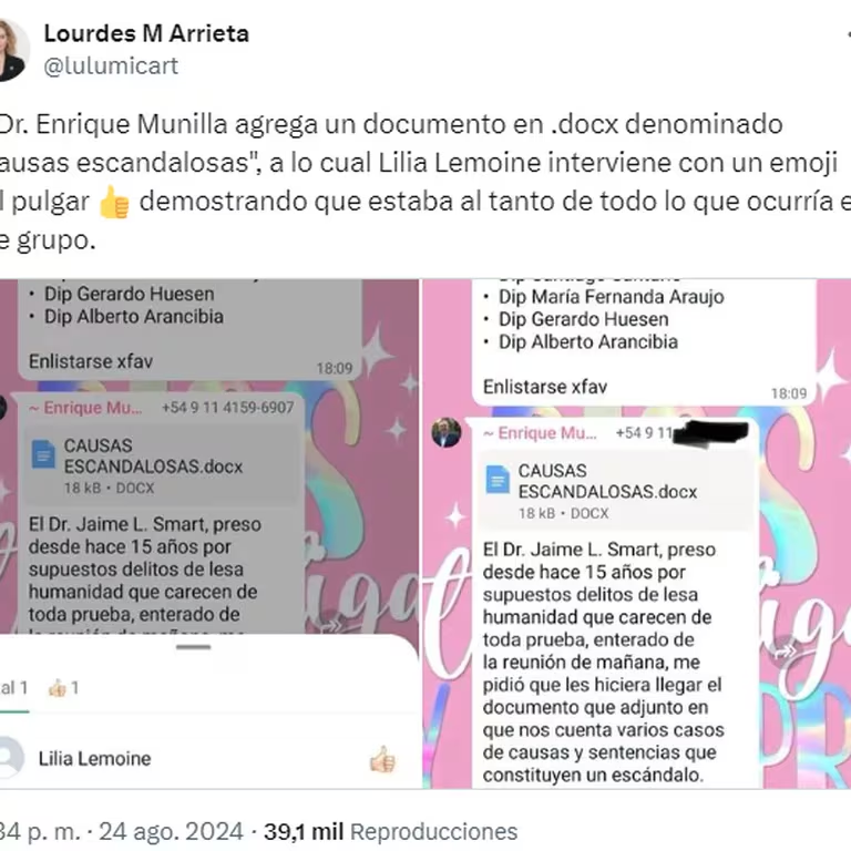 Una vez que mostró el mensaje de bienvenida que le habría escrito Ravasi el 23 de febrero pasado, la mendocina no solo recordó que no fue la única del bloque que participó del mismo, sino que sumó los nombres de otros legisladores a la lista. “Entré porque en ese grupo ya estaban muchos de mis colegas que hoy fingen demencia: Lemoine, Ponce, Orozco, Mayoraz, Santurio, Benedit, Ferreyra y Araujo”, recriminó al hacer referencia a los cruces que sostuvo con Lemoine y Mayoraz. A este último lo denunció por violencia de género y agresiones.