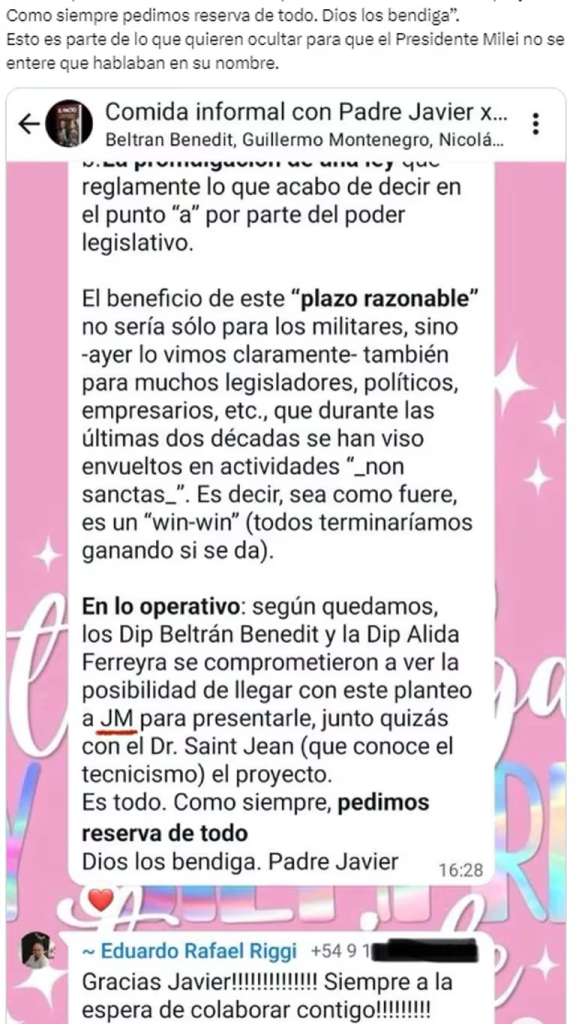Acto seguido, según lo publicado por Arrieta, el cura les pide a los miembros del grupo que confirmaran su asistencia a una “reunión informal y reservada por tema proyecto milit” que presuntamente se habría realizado el pasado 14 de marzo a las 19:30 horas en la calle Montevideo 871, en la Ciudad de Buenos Aires. La diputada aceptó la invitación, para la cual los también legisladores Alida Ferreyra, Beltrán Benedit, Celeste Ponce, Carlos Zapata, los abogados Laura Olea, Ricardo Saint Jean y el ex juez de Casación Eduardo Riggi ya habían confirmado su asistencia.