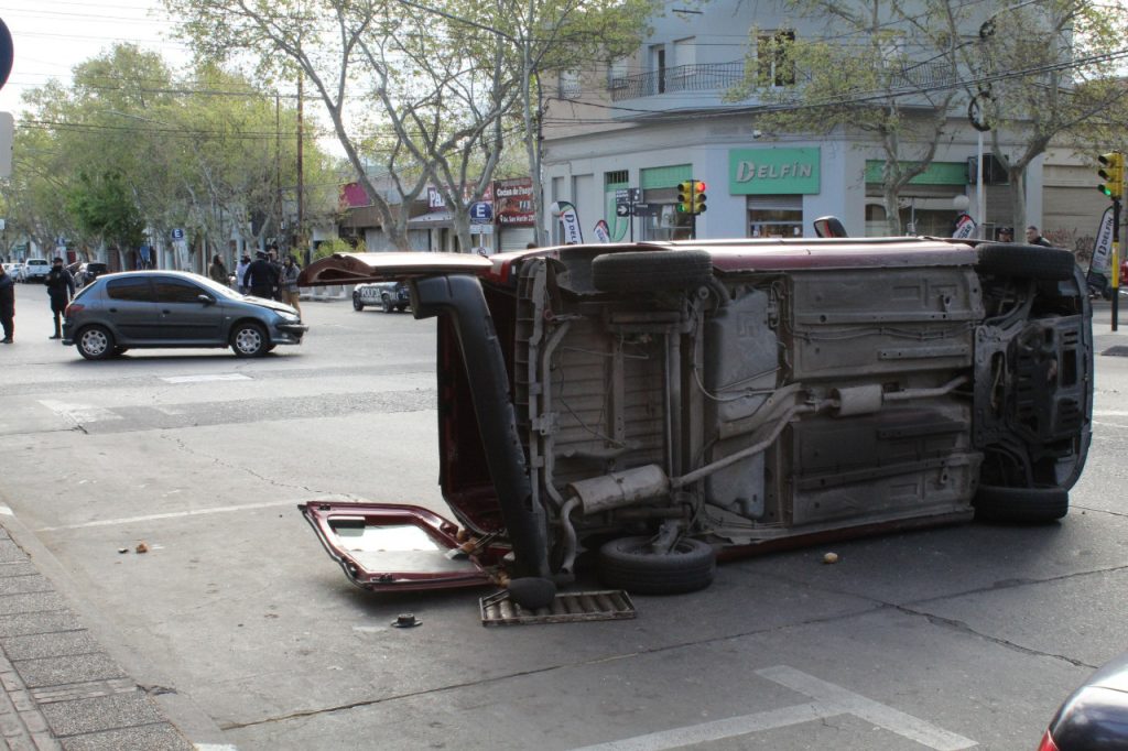 Un aparatoso siniestro vial se produjo esta mañana en la esquina de avenida San Martín y Day. Allí, un Peugeot que se dirigía por Day hacia el este y una Citroën Berlingo perteneciente de una panadería local que se dirigía hacia el sur por San Martín impactaron fuertemente, provocando el vuelco de este segundo vehículo.