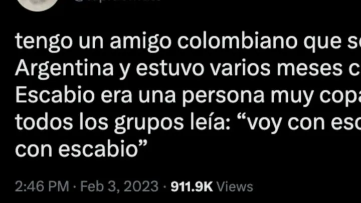 «Tengo un amigo colombiano que se vino a vivir a Argentina y estuvo varios meses creyendo que Escabio era una persona muy copada porque en todos los grupos leía: “Voy con escabio” o “Vengan con escabio”», escribió el usuario viral.