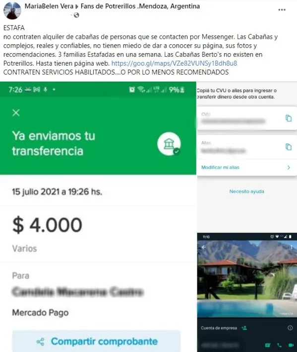 En Facebook existen cientos de grupos que ofrecen alojamientos en Mendoza. Un destino que tiene mucha demanda es Potrerillos, y las advertencias de los usuarios por estafas online son moneda corriente.