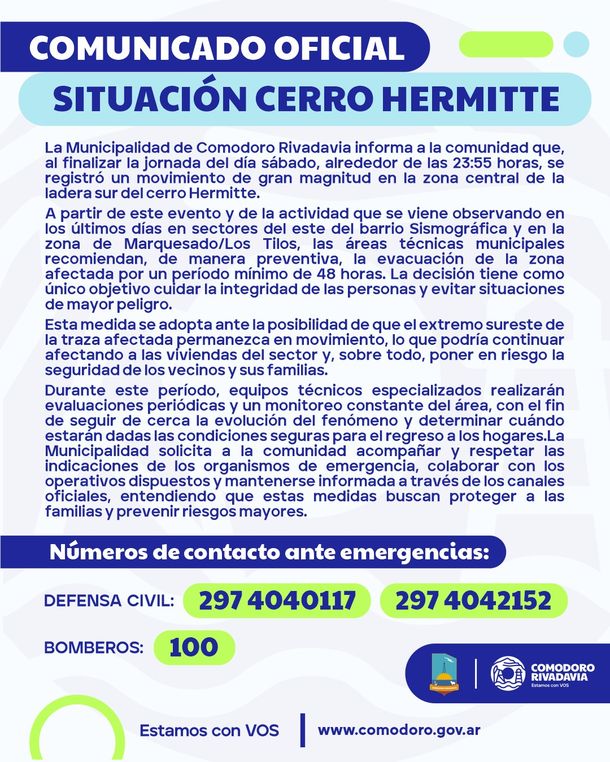 Lejos de apaciguarse, la situación de emergencia geológica se agravó en las últimas en las últimas horas. Desde la Municipalidad ordenaron una evacuación preventiva del barrio Médanos, ubicado en una de las zonas más expuestas a la inestabilidad del cerro Hermitte.