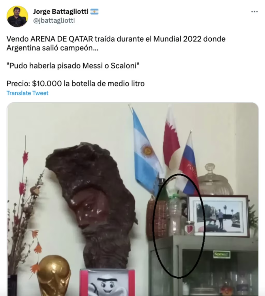 Al llegar a la Argentina, armó los envoltorios y entregó los regalos a quienes se los había prometido. Luego, publicó en redes sociales que quién quisiera arena de Qatar, le pidiera, porque le había sobrado. Sin embargo, para marzo de este año todavía tenía dos botellas. “Con el resurgir de la fiebre mundialista, con la Selección en el Monumental y demás, decidí volver a publicar en redes sociales, pero esta vez vendiéndola para juntarme unos pesos y además pagar lo que gasto en la papelera”, remarcó. Resulta que la publicación se viralizó.