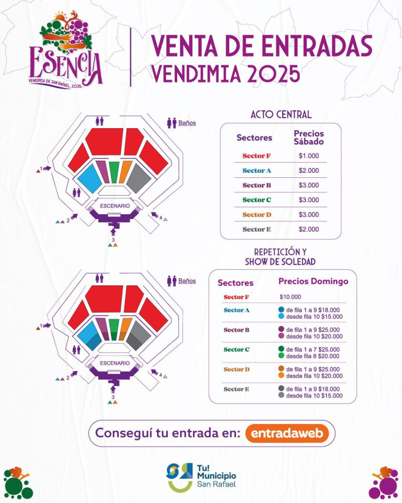 En tanto que las localidades para presenciar la repetición vendimial y el show de Soledad, cuestan $10.000 (arriba), $15.000, $18.000, $20.000 y $25.000 (abajo) y se obtienen por ambos puntos de venta.