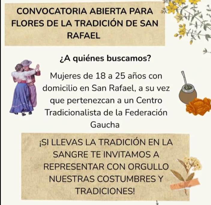 Para poder participar, lo más importante es que tengan conocimientos respecto de las raíces folclóricas, que sepan de campo, de montura, de todo aquello ligado a la tradición que se vive como un folclore vigente. Además, deben tener entre 18 y 25 años. “La edad tiene que ver con un reglamento que hay a nivel provincial con respecto a la Flor de la tradición, teniendo en cuenta que es la representación de esa mujer de campo, de esa mujer cuyana, de esa mujer de ciudad que vivió hace un par de años atrás”, dijo Taboada y agregó: “Desde Mendoza, donde está nuestra sede provincial en cuanto a todo lo que tiene que ver con la Federación Gaucha de San Rafael y demás, tienen ciertos requisitos que cumplir las chicas como para poder largar nosotros y podemos seleccionar nuestra flor departamental”.