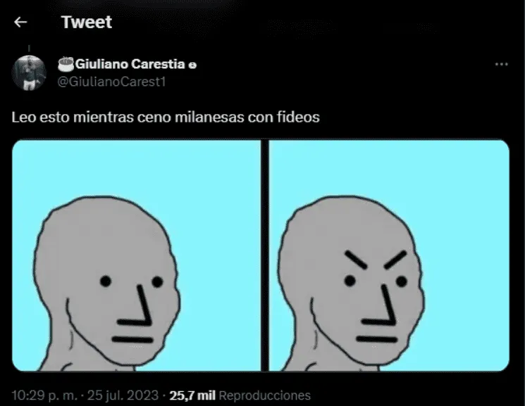 La usuaria de Twitter “@bel_bozzolo” comenzó explicando en el tuit de la polémica, que su mamá “jamás en la vida” había preparado milanesas acompañadas de fideos. “Me enteré de grande que la gente comía esa combinación y en mi cerebro no tiene sentido.”, afirmó la joven respecto al mítico y tradicional plato culinario en nuestro país.