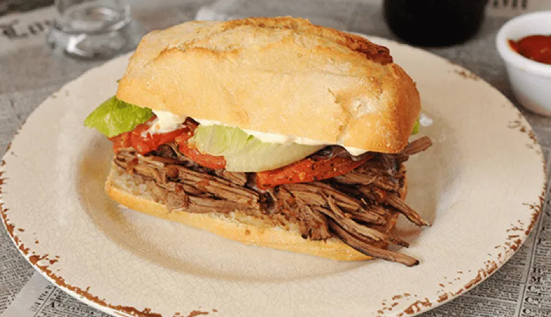 -Deja reposar la pieza un par de minutos antes de cortarlo en tiras. Toma el pan de miga o telera y coloca las tiras de carne. Agrega lechuga, rodajas de tomate y cebolla, y un toque de mayonesa o chimichurri, que son clásicos en los sándwiches nacionales. Listo, disfrutá.