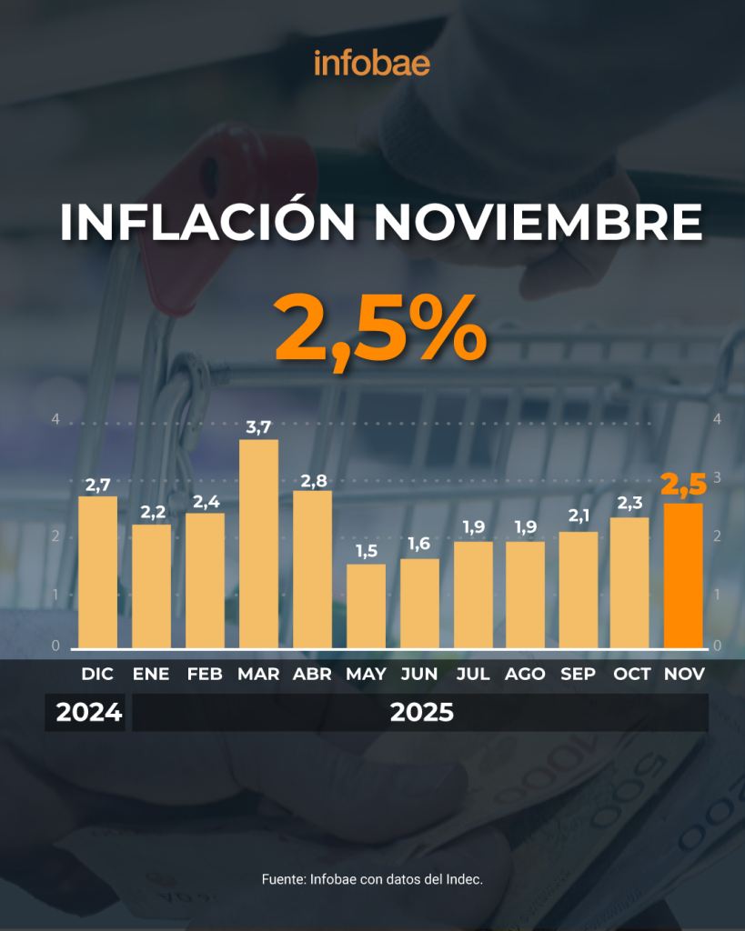 Luego de que el IPC se ubicara en 2,5% en noviembre, las consultoras privadas (Eco Go, Analytica y LCG) contactadas por Infobae coincidieron en que se mantendrá en el mismo nivel. Un dato que, de confirmarse, implicará el quinto mes consecutivo de aceleración en los precios.