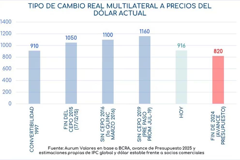 2) Proyecciones de atraso cambiario. El anteproyecto de Ley de Presupuesto -con un dólar oficial a $1.016 para fin de año- y las declaraciones del ministro Caputo ratificaron el sendero de devaluación gradual de 2% mensual hasta fin de año. Un informe de Aurum Valores indicó que el tipo de cambio oficial hoy se encuentra en un nivel comparable al de 1997, en el ramo final de la convertibilidad, cuando ya se debatía sobre la apreciación real del peso en aquel régimen de “uno a uno” con el dólar. Asimismo, mantener el crawling peg hasta fin de año, como prevé el avance del Presupuesto, profundizaría aún más el atraso cambiario.