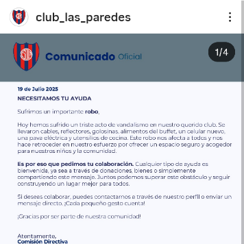 «Esto no es solamente un robo de objetos, es un golpe a la ilusión de nuestros chicos y de toda la familia de Defensores Las Paredes», afirmó el club en un comunicado.