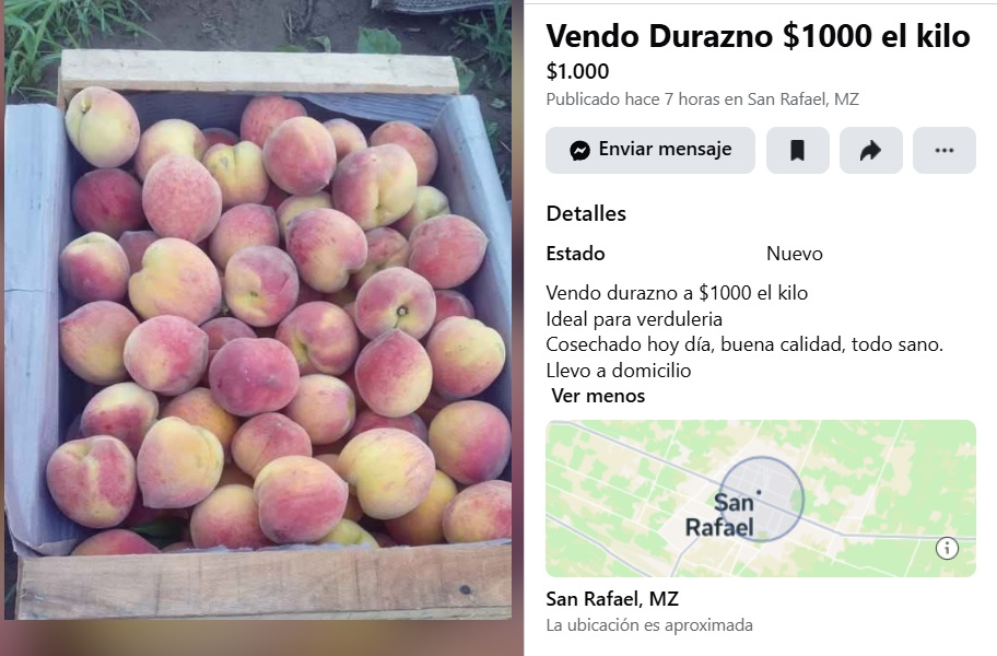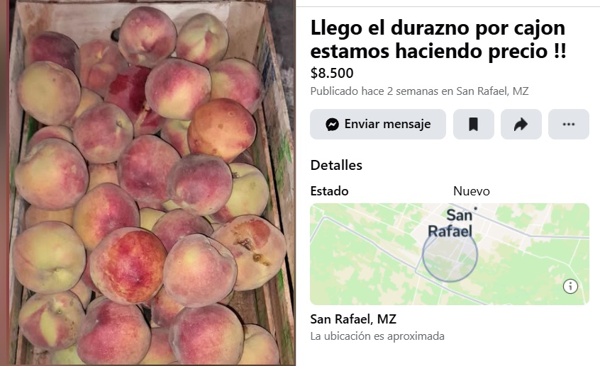Mientras tanto, en plena temporada, la realidad vuelve a repetirse: el durazno —símbolo histórico de la fruticultura del sur mendocino— hoy se vende, literalmente, a precio de remate.