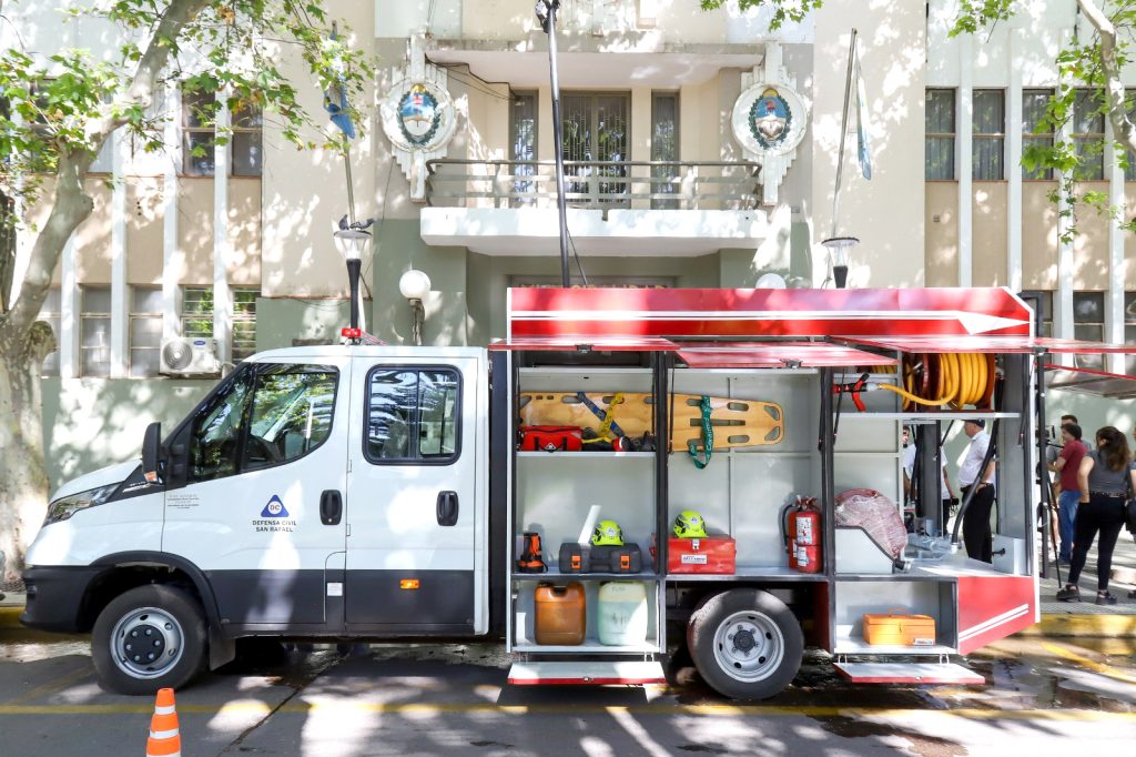 El que recibió Defensa Civil, es un camión Iveco comprado durante la gestión de Emir Félix, que cuenta con un tanque de 2 mil litros de agua con bomba, con grupo electrógeno, motosierra, elementos de seguridad, mochilas de agua, mangueras para trabajar en fincas o en zonas urbanas. “Tiene buena capacidad para trabajar en lo rápido, en lo inmediato y es para trabajar tanto en ciudad como en el campo. Dios quiera que no lo usemos, que no haga falta, pero hay que estar preparados para todo esto. Tiene escalera, torre de iluminación, tanto por si hay que apuntalar una vivienda o un techo”, señaló Crescitelli.