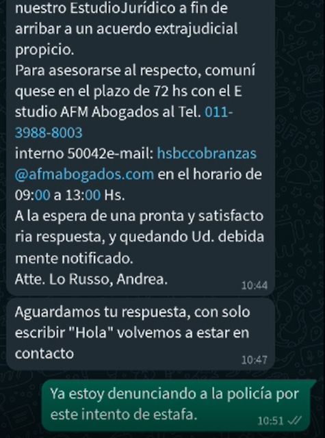 Silvina recibió un mensaje de Whatsapp, supuestamente del banco HSBC, firmado por una persona que decía llamarse “Andrea Ruso”, con una notificación por una “deuda en el banco”. La supuesta destinataria era alguien de nombre Natalia Cecilia. “Lo que me dicen es que me contacte en 72 horas, para llegar a un arreglo de esta deuda, así que me dejan un e-mail donde supuestamente me tengo que comunicar para solucionarla. Ya he recibido correos con la misma deuda y ya respondí que voy a notificar a la Policía”, señaló.