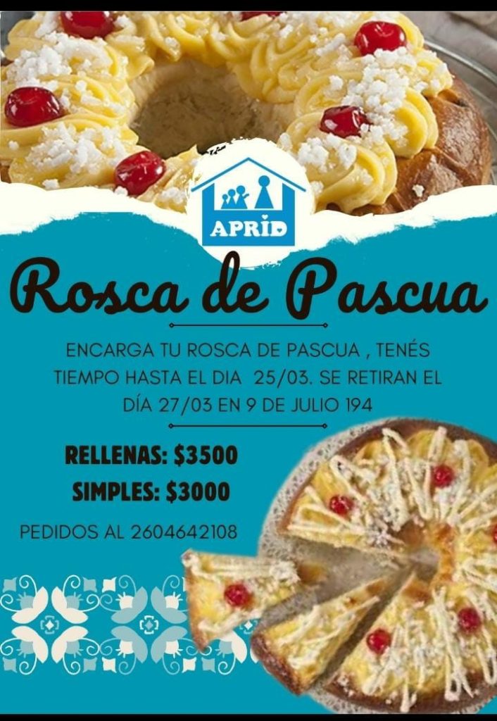 Los interesados en comprar alguna de estas roscas que estarán listas para ser retiradas el miércoles 27 de marzo, pueden hacer encargos de 8 a 17 en la sede de APRID (Av. 9 de Julio 194); si no, a través de las redes sociales de la institución o del teléfono 4432385. Como opción, Méndez recomendó pasar por la panadería ubicada en la misma sede, ya que se pueden conocer allí mismo las roscas, además de otros productos que ofrecen.