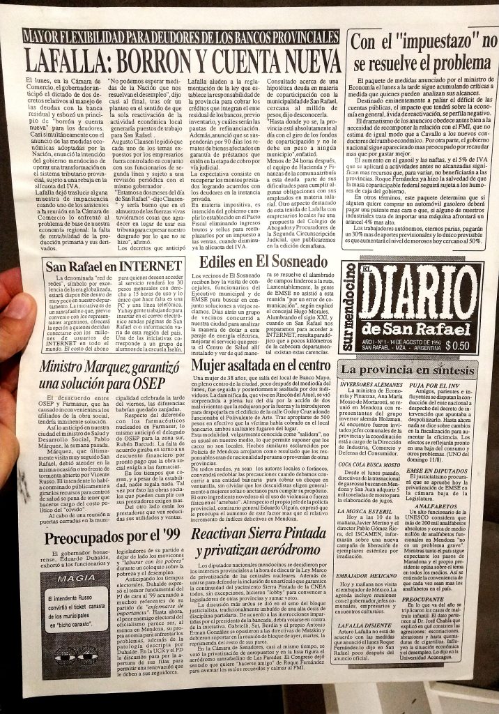 Y así el Diario San Rafael, con el característico slogan “La Información Justa”, se convirtió en el diario de los sanrafaelinos. Bajo la premisa de ser un recurso que aportara al desarrollo de la región, rápidamente se transformó en un vehículo entre la comunidad y las fuerzas vivas departamentales. En estas páginas se destacaron los aciertos, pero también los errores de nuestros gobernantes, sin ánimo de ser cultores de la verdad, sólo con el propósito de generar – desde el Diario – una herramienta para consolidar lo bueno y corregir lo malo que pudiera suceder en nuestra tierra.