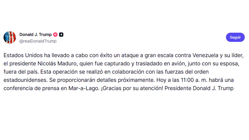 “Estados Unidos ha llevado a cabo con éxito un ataque a gran escala contra Venezuela y su líder, el presidente Nicolás Maduro, fue capturado y trasladado en avión junto con su esposa, fuera del país”, escribió en un mensaje en su red Truth Social.
