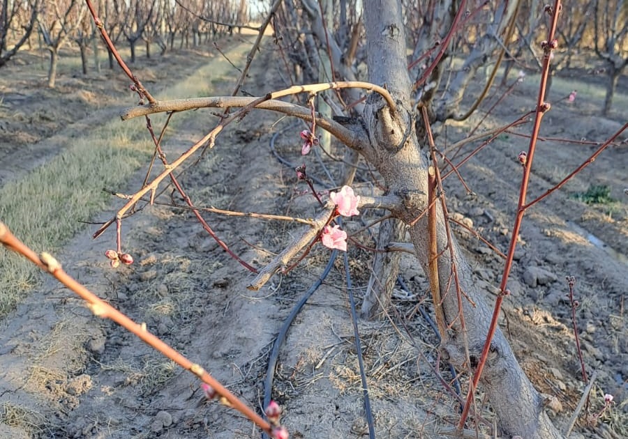 Las primeras variedades de durazno ya se encuentran con la corola visible iniciando la floración, mientras que algunos duraznos industriales también registran algunos movimientos, aunque depende de los riegos en las plantas. Lo mismo sucede en las pocas fincas donde mantienen el cultivo de damasco.