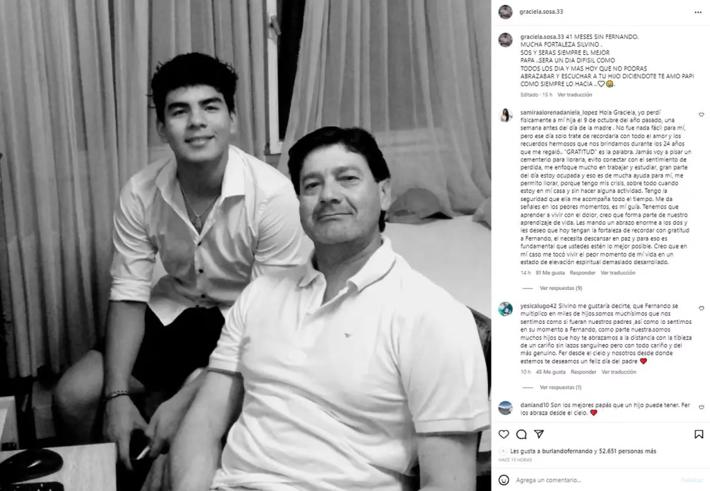 La publicación se llenó de comentarios de apoyo hacia la familia. “Silvino, me gustaría decirte que Fernando se multiplicó en miles de hijos. Somos muchísimos que nos sentimos como si fueran nuestros padres, así como lo sentimos en su momento a Fernando, como parte nuestra. Somos muchos hijos que hoy te abrazamos a la distancia, con la tibieza de un cariño sin lazos sanguíneo, pero con todo cariño y del más genuino. Fer desde el cielo y nosotros desde donde estemos te deseamos un feliz Día del Padre”, le escribió una joven.