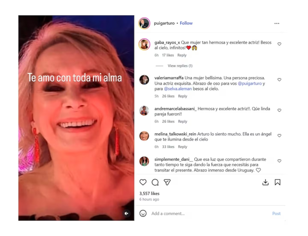 “Te amo con toda mi alma”, escribió Puig en su cuenta de Instagram, junto a una imagen de la actriz, en un gesto que rápidamente generó repercusión entre seguidores y colegas del espectáculo.