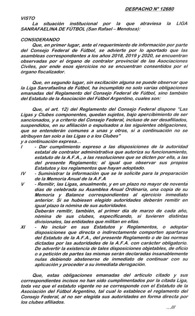 Este viernes por la tarde el Consejo Federal envió un comunicado en el cuál sobresale la suspensión de la Liga Sanrafaelina de Fútbol en forma provisional todo hasta que regularice la situación institucional.